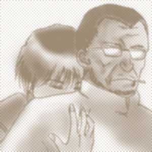 も一発、ノックスに抱きついているロイ・・うわー乙女だよ増田! キモッ!これも原画は右(ちょっとトリミングしてますが)。 こちらの着色は、フォトショップのエアブラシツールがメイン。 原画が原画なもんで、あんまり丁寧にはできませんでした(苦笑)。 ノックスはかなりコツをつかんだのですが、ロイが・・誰、これ? (初出:05年10月5日) |
